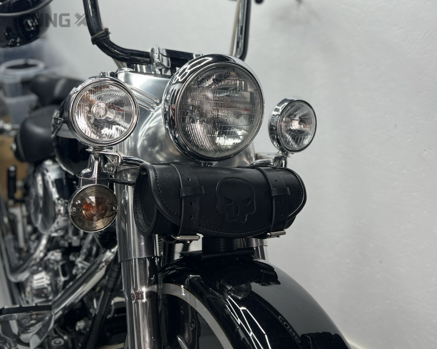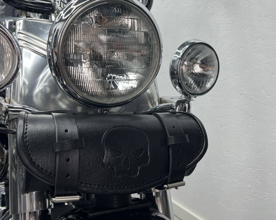 Tool Roll med syet dødningehoved produceret i okselæder, som er slidstærkt og nemt at vedligeholde. Indersiden består af hård plastik som forstærker formen på tasken.